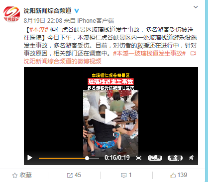 8月19日,沈阳新闻综合频道微博发布文章《#本溪# 桓仁虎谷峡景区玻璃栈道发生事故,多名游客受伤被送往医院》阐述:今日下午,本溪桓仁虎谷峡景区内一处玻璃栈道游乐设施发生事故,多名游客受伤。