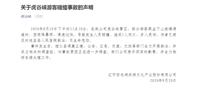8月20日,虎谷峡微信公众号发布文章《关于虎谷峡游客碰撞事故的声明》指出:2020年8月19日下午约13点30分,在我公司虎谷峡景区,部分游客乘坐下山玻璃滑道时,因突降暴雨、滑速过快,导致发生人员碰撞,造成1人死亡,多人受伤,伤者已被及时送至县人民医院救治,无生命危险。
