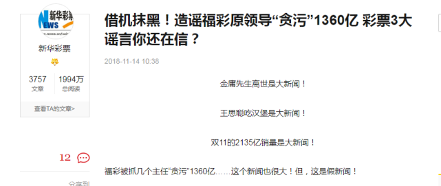 1300多亿是多大的数字?印刷的话大约需要1500吨纸,运输的话需要200辆卡车才能运走。1300多亿是福彩游戏品种“中福在线”在2002年到2014年的总销售额!不用成本,不用上缴国库,过分夸张。这是典型的旧谣,每隔一段时间就重复出现在网络上,让人信以为真。虽然多家权威媒体已辟谣,但是仍然很多人相信这类谣言。可谓,造谣一张嘴,辟谣跑断腿。如何更精准有效的辟谣,值得大家积极探索与研究。