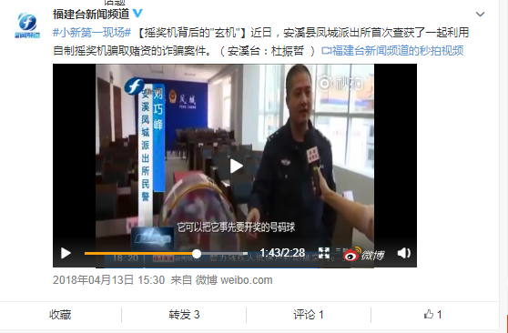 2018年4月13日,福建台新闻频道微博发布文章《摇奖机背后的"玄机"》:近日,安溪县凤城派出所首次查获了一起利用自制摇奖机骗取赌资的诈骗案件。