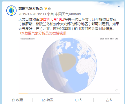 而据科学科普博主“数值气象分析员”预告:2021年6月10日将有一次日环食,环形相位日食在(俄罗斯、格陵兰岛和加拿大北部的部分地区)都可以看到。如果天气良好,在(北亚、欧洲和美国)的朋友们将会看到日偏食。