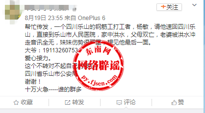 “帮忙转发,一个四川乐山的钢筋工打工者,杨敏,请他速回四川乐山,直接到乐山市人民医院,家中洪水,父母双亡,老婆被洪水冲走音讯全无,妹妹伤势很严重,想见他最后一面。