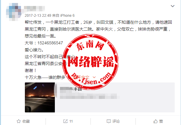 另外,网络辟谣举报平台记者注意到,多年来,网上热传类似家中失火爱心接力寻人包括“湖南打工者吴云飞”、“黑龙江打工者王海涛”、“黑龙江打工者田文琪”、“郴州打工者杨星”、“四川内江打工者康宏军”等消息,中国消防、各地公安以及权威媒体都曾公开辟谣,但每隔一段该消息变个人名,变个地点又重出江湖。