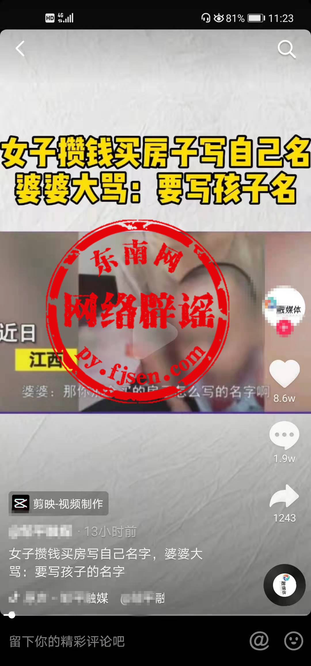 近日,网上热传"婆媳买房吵架"视频,引发网民的关注。视频称,江西一网民爆料攒钱买房子要写上自己名字,却被婆婆骂傻,婆婆要求房产证要写孩子名字。有媒体还以《女子攒钱买房写自己名字,婆婆大骂:要写孩子名字》为题转发该视频。