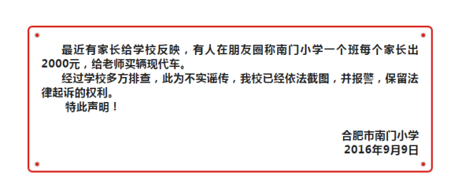 真相:合肥市南门小学2016年9月9日在其微信公众号发布文章《公告:网传家长为老师凑钱买车为不实谣传,我校已经报警》进行辟谣。文章指出:经过学校多方排查,此为不实谣传,我校已经依法截图,并报警,保留法律起诉的权利。
