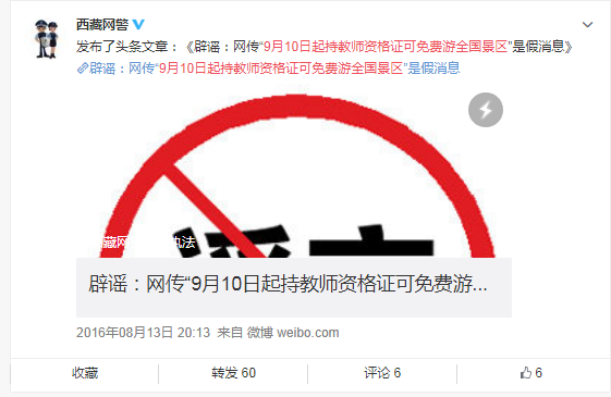 真相:2016年8月13日,西藏网警微博辟谣:经西藏网警核实,此消息内容不实,还望教师们仔细甄别。目前全国仅有部分景点针对老年证、学生证等有折扣优惠,教师证在暑期、教师节等特殊节假日有一定幅度的优惠,并没有持教师资格证可以全国免费游所有景点一说。