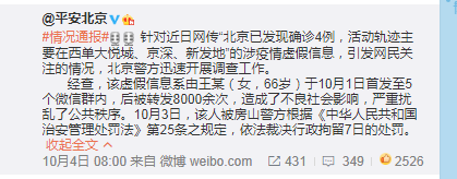 经查,该虚假信息系由王某(女,66岁)于10月1日首发至5个微信群内,后被转发8000余次,造成了不良社会影响,严重扰乱了公共秩序。10月3日,该人被房山警方根据《中华人民共和国治安管理处罚法》第25条之规定,依法裁决行政拘留7日的处罚。