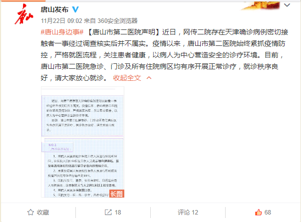 近日,网传二院存在天津确诊病例密切接触者一事经过调查核实后并不属实。疫情以来,唐山市第二医院始终紧抓疫情防控,严格就医流程,关注患者健康,以病人为中心营造安全的诊疗环境。目前,唐山市第二医院急诊、门诊及所有住院病区均有序开展正常诊疗,就诊秩序良好,请大家放心就诊。