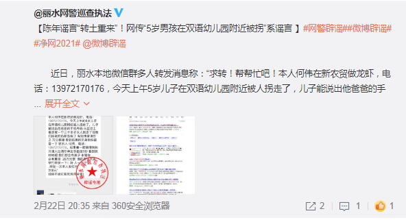 经丽水网警核实,我市暂未接到类似警情,该信息中反映的情况不属实,系谣言。经搜索发现,以上谣言在各大贴吧、论坛、网站都有流传,只是地点姓名稍作更改。多地警方已发文辟谣,请市民朋友停止转发该不实信息。