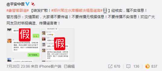 转发扩散!郑州常庄水库爆破决堤是谣言。经核实,属不实信息!