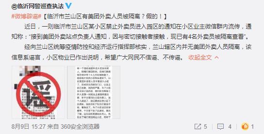 经向兰山区统筹疫情防控和经济运行指挥部核实,兰山辖区内并无美团外卖人员隔离,该信息系谣言,小区物业已作出说明,希望广大网民不信谣、不传谣。