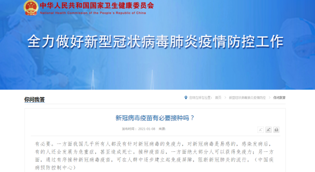 中国疾病预防控制中心阐述:接种疫苗后,一方面绝大部分人可以获得免疫力;另一方面,通过有序接种新冠病毒疫苗,可在人群中逐步建立起免疫屏障,阻断新冠肺炎的流行。有必要接种新冠疫苗。