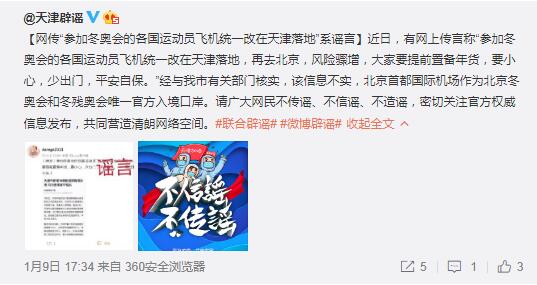 近日,有网上传言称“参加冬奥会的各国运动员飞机统一改在天津落地,再去北京,风险骤增,大家要提前置备年货,要小心,少出门,平安自保。”经与天津市有关部门核实,该信息不实,北京首都国际机场作为北京冬奥会和冬残奥会唯一官方入境口岸。请广大网民不传谣、不信谣、不造谣,密切关注官方权威信息发布,共同营造清朗网络空间。
