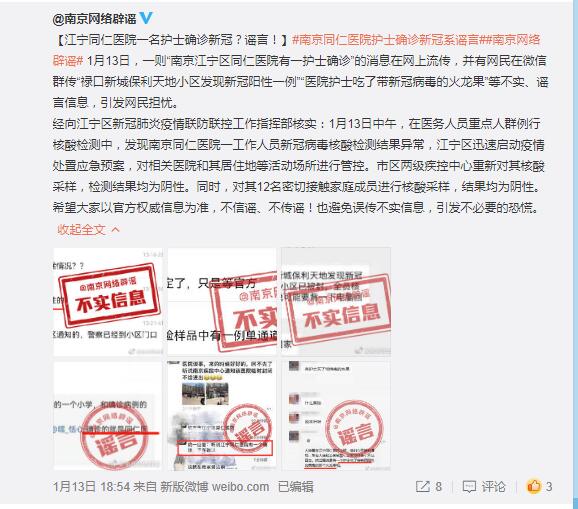 1月13日,一则“南京江宁区同仁医院有一护士确诊”的消息在网上流传,并有网民在微信群传“禄口新城保利天地小区发现新冠阳性一例”“医院护士吃了带新冠病毒的火龙果”等不实、谣言信息,引发网民担忧。
