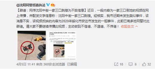 近日,一段内容为一家三口倒地的视频在网上传播,并配发文字信息称:沈阳中街一家三口跳楼。经核实,沈阳市近期未发生类似事件,该消息不实,该视频反映的内容为2020年绥化市安达市发生的一起事件,此前已有多地网警对此辟谣。请大家不要继续传播此视频,主动做到不信谣、不造谣、不传谣!