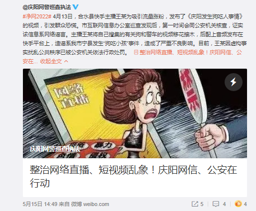 4月13日,合水县快手主播王某为吸引流量涨粉,发布了《庆阳发生狗吃人事情》的视频,引发群众恐慌。市互联网信息办公室巡查发现后,第一时间会同公安机关核查,证实该信息系网络谣言。主播王某将自己搜集的有关狗和警车的视频移花接木,后配上音频发布在快手平台上,造谣系我市宁县发生“狗吃小孩”事件,造成了严重不良影响。目前,王某因虚构事实扰乱公共秩序已被公安机关依法行政处罚。