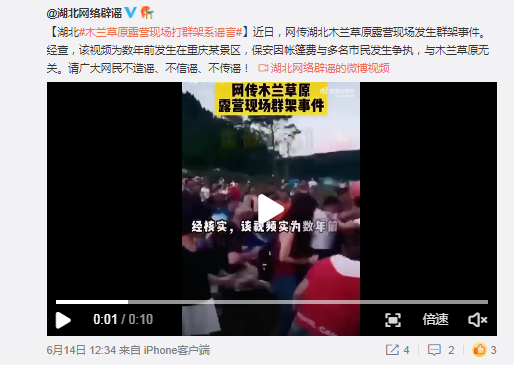 近日,网传湖北木兰草原露营现场发生群架事件。经查,该视频为数年前发生在重庆某景区,保安因帐篷费与多名市民发生争执,与木兰草原无关。请广大网民不造谣、不信谣、不传谣!
