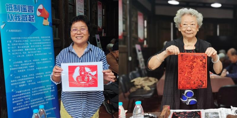 在民俗手工体验区,柘荣剪纸省级非遗传承人吴秋凤指导居民共同制作辟谣主题剪纸与拓印版画。省互联网辟谣平台工作人员还结合老年群体特点,现场向居民列举了典型网络谣言案例,讲解了如何识别网络谣言,介绍了如何开展网络举报。通过活动,让大家既感受到非遗的魅力,又增长了识谣辨谣的能力和网络举报知识。