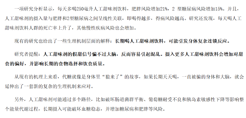 央视新闻曾报道称,一项研究分析显示,每天多喝250毫升含有人工甜味剂饮料,肥胖风险增加21%,2 型糖尿病风险增加15%。并且,人工甜味剂的摄入量与肥胖和2型糖尿病之间呈线性关联,即喝得越多,得病风险越高。