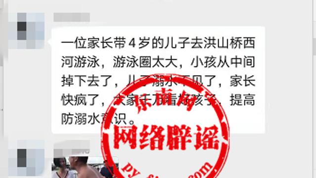 近日 ,微信群热传“洪山桥西河4岁小孩溺水不见”的消息,引发网友关注。网络辟谣举报平台记者核实,网传消息系谣言。