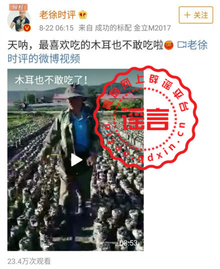 信网8月24日讯 这两天,你的亲友微信群里可能正在疯传这样一个“黑木耳打农药”的视频。