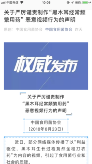一时间,这段视频在网络上引发广泛关注,很多网友表示怀疑“难道又一个喜欢的食物沦陷了吗”,也有不少网友谴责“食品安全一次次刺激我们的底线”...... 就在视频内容逐渐发酵之际,8月23日,中国食用菌协会通过其官方微信发布了关于严厉谴责制作“黑木耳经常频繁用药”恶意视频行为的辟谣声明。