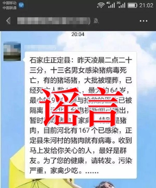 【拆解】记者检索发现,这则谣言早在2016年就开始传播,谣言“范本”大概为:一所当地医院+具体的时间+具体的感染病毒死亡人数+对感染人数的基本描述(年龄、性别等)+电视台报道+友情提示+求转发,求扩散。 这种谣言具有“接近性”:当地的医院,具体的时间,日常的饮食习惯;“恐吓性”:如上万人被感染,很多人死亡;“权威性”:电视台播出新闻;“博同情”:利用“帮别人也是帮自己”博取同情,获得转发。 【小知识】早有专家表示,不存在“sk5”、“bp5”、“sb250”病毒。因此,下次再遇到这类由字母和数字组成的所谓“病毒”时,搜索一下,便知真假。 2、“正定13名男女感染猪病毒死亡” 【谣言】石家庄正定县:昨天凌晨二点二十三分,十三名男女生感染猪病毒死亡,有的猪场猪,大批被埋葬,已经死亡人数13人,最大的67岁,最小的9岁,参与抢救的医生已被隔离,河北一台电视新闻己播出,暂时别吃猪肉、家禽,特别是猪肉,目前河北已有167个已感染,正定县朱河村的猪肉就有病毒,收到马上发给你关心的人,最好是群友。为了您的健康,请转发。污染严重,家禽少吃……