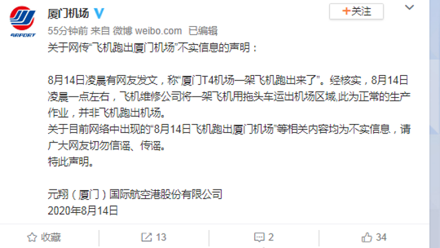 经核实,8月14日凌晨一点左右,飞机维修公司将一架飞机用拖头车运出机场区域,此为正常的生产作业,并非飞机跑出机场。