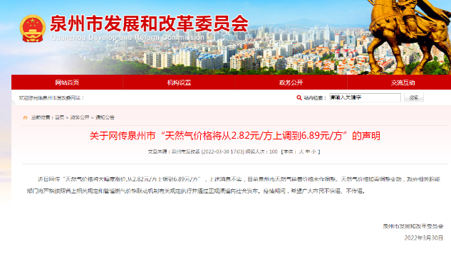 3月30日,泉州市发展和改革委员会在官方网站上发布《关于网传泉州市“天然气价格将从2.82元/方上调到6.89元/方”的声明》对此进行回应。