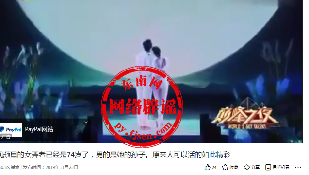 (第13届金鹰节开幕式晚会微博截图) 可见,所谓的“视频里的女舞者已经74岁了”纯属瞎编,“男的是她孙子”更是假的离谱! 网络辟谣举报平台记者注意到,2019年11月的时候,网上也曾热传另外一段绝美的舞蹈视频,有网友惊叹:惊呆现场,74岁老奶奶携孙子共舞惊人之作视频中的女舞者是男舞者的奶奶,她今年已经74岁了。这段舞蹈,让人们看到了生命的无限潜能!诸位,你被74岁老奶奶的舞技和体质惊到了吗?