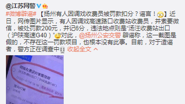 近日,网传图片显示,有人因调戏高速路口收费站收费员,并索要微信,被处罚款200元,并记6分,违法地点则是“汤汪收费站出口(沪陕高速G40)”对此,扬州公安交警辟谣称,这一截图是假的,不存在这一罚款项目,也根本没有此事。目前,对于造谣者,警方正在调查中。