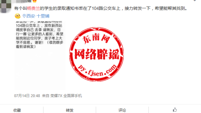 近日,网上热传:有谁认识李仕兰、杨贵兰这个学生,麻烦告知一声,录取通知书掉在104路公交车上,放在新西站调度亭自己去拿请转发,日行一善让更多的人看到,希望能找到这位同学,孩子考上大学不容易。谢谢!(谁的群多看到请转发)。