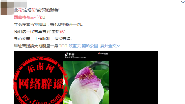 网传消息截图 近日,网上热传“西藏特有的吉祥花”消息,消息内容如下:它的名字叫“宝塔花”或“玛哈默鲁”,西藏特有的吉祥花。 喜马拉雅山上的宝塔花每隔400年盛开一次。有幸看到宝塔花开是我们的福泽。 转发分享,让朋友看到, 祝你后半生好运!并附上该花的图片或者视频。 这是真的吗? 网传消息截图 首先,根据网络查询发现,网传图片系热带植物棋盘脚的花苞。 棋盘脚花图片 其次,中国科普博览介绍:棋盘脚树名的由来,是因其果实像是围棋棋盘桌的桌脚。棋盘脚的叶形较圆胖,花序为短而直立的总状花序,花径可达10-12 cm,果实亦长约10-12 cm。棋盘脚喜高温多湿的天气,仅分布于南部的恒春半岛及兰屿。 中国科普博览文章截图 博物杂志科普:滨玉蕊的果子,长得像棋盘的桌脚,所以又叫“棋盘脚”。别看硬,但是能漂在海上,扩散到别的岛屿。它的花有机会要看,极美,但是每朵只开一晚上,天一亮就掉。 博物杂志微博截图 可见,网传消息不实! 网络辟谣举报平台提醒: 面对海量网络信息,广大网民要擦亮双眼,学会辨识信息的真伪,对于未经核实的消息,不要随意转发,以免成为谣言的助推手。 |