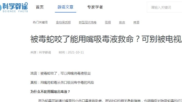 流言:被毒蛇咬了,可以用嘴将毒液吸出 真相:用嘴将蛇毒从伤口吸出有中毒的风险 为什么不能用嘴吸出毒液? 因为蛇毒可能通过嘴里的小伤口毒害救助者。而WHO的相关急救指南,也明确反对吮吸蛇毒的行为。 如果不能,那应当怎么处理蛇咬伤? 如果怀疑被毒蛇咬伤,应立即想方设法将伤者送往医院救治,这是最重要的! 如果实在是无法及时送医,做以下事情可能会有一点帮助: 尽快使用绷带或者丝袜、布条、手帕等弹性低或无弹性的布条,结扎伤口的近心端,并注意每隔20-30分钟松绑1-2分钟,需要注意不要绑得过紧,也不建议使用止血带。 ·如万不得已,可以将伤口做十字切开,使用拔火罐或负压设备吸出毒液(再次强调,不要直接用嘴),并寻找是否有蛇毒牙断在伤口中。也可隔着安全套吮吸,或将一次性注射器一头切掉,反向插入活塞用来制造负压吸出毒液。 再次提醒,以上手段如果由非专业人员操作,对伤者可有一定风险,应优先创造条件将伤者送医。 咬人的蛇,要打死吗? 不推荐。应优先将伤者移走,并与蛇保持距离。如需要驱赶或移走蛇,应用长木棍、长树枝,不可徒手,以免被咬。此外,如条件允许,最好拍下蛇的照片,以便确定蛇的种类,方便医生对伤者进行针对性的救治。 如何避免被蛇咬? 考虑到经常出野外的专业人员,都会学习毒蛇防御知识,下面主要针对普通游客介绍一点防蛇咬小知识。 首先,所谓君子不立危墙之下,我们应当尽量去相对较为成熟的景区游玩,而不是去人迹罕至的地方“探险”,这样就能大大减少遇蛇的可能,万一出现意外也更方便送医。 此外,古话说“打草惊蛇”,我们在徒步、登山、健走时,可以使用登山杖,如遇到草丛、落叶,可以先用杖来敲打探路,将蛇惊走。更重要的是,在野外,迈步或伸手抓握树木或树干时,一定要先看清楚,大部分毒蛇反应有点迟钝,打草惊蛇无法确保惊走它们,如果不小心踩着或抓着毒蛇,容易被毒蛇咬伤。 如果带着小孩出游,则一定要教育好孩子,不要钻草丛,不要翻大石头玩,以免惊吓到藏身其下的蛇或其他动物,造成伤害。 毒蛇为什么这么毒,是诚心跟人过不去吗? 这个有点冤枉蛇了,其实蛇分泌毒液非常消耗能量,而毒液的主要作用是捕食猎物。很多蛇毒的毒性很高,是为了更有效地毒死抗毒性能越来越高的猎物,而不是为了针对人类——毒蛇即使咬死人,它也没法吞下去,只是碰巧很多蛇毒对人体特别有效罢了。 本文由“科学辟谣平台”(ID:Science_Facts)出品 |