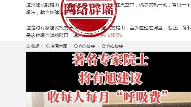 近日,网上传播着“专家建议征收呼吸税”的消息,消息称:著名专家院士蒋有绪建议每人每月收呼吸费20元。 网传消息截图 这是真的吗?