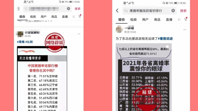网传消息截图 首先,网传数据其实是2020年第一季度各省的离结比。 其次,离结比不等于结婚率。离结比是一定时期内离婚对数与结婚对数之比,而某年的离婚率=某年离婚对数/某年的平均人口数×1000‰。民政部2020年第一季度例行新闻发布会上,民政部社会事务司司长王金华表示:社会上一些声音将“离结比”等同于离婚率,不科学、不严谨,也是极不严肃的。 再次,根据最新的国家统计局发布的《中国统计年鉴2021》2020年天津的离婚率4.92‰全国最高,吉林离婚率4.07‰。 纵观2012年-2020年九年期间,全国粗离婚率在2.29‰-3.36‰。 网传71.51%离婚率明显与实际不符。