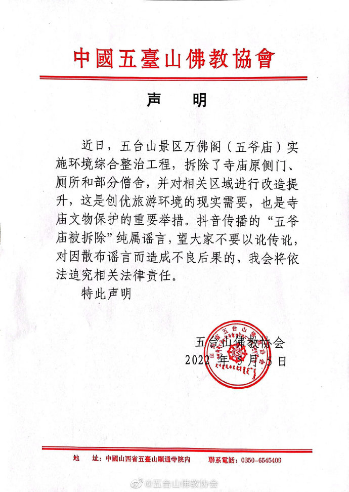 近日,五台山景区万佛阁(五爷庙)实施环境综合整治工程,拆除了寺庙原侧门、厕所和部分僧舍,并对相关区域进行改造提升,这是创优旅游环境的现实需要,也是寺庙文物保护的重要举措。某短视频平台传播的“五爷庙被拆除”纯属谣言,望大家不要以讹传讹,对因散布谣言而造成不良后果的,我会将依法追究相关法律责任。
