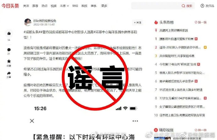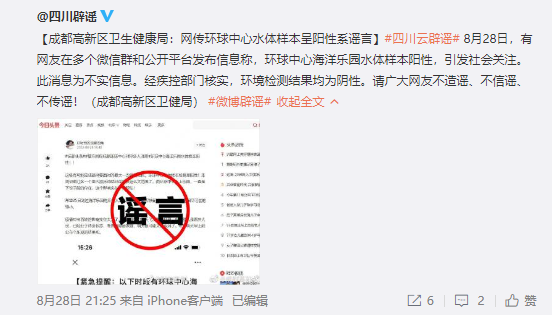 8月28日,有网友在多个微信群和公开平台发布信息称,环球中心海洋乐园水体样本阳性,引发社会关注。此消息为不实信息。经疾控部门核实,环境检测结果均为阴性。请广大网友不造谣、不信谣、不传谣!(成都高新区卫健局)